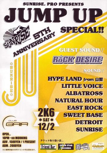 JUMP UP シリーズのスペシャルとしてお送りする、アニバーサリーダンスは、リニューアルオープンしたばかりのCLUB GAIAでのサウンドナイト!!